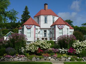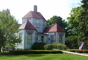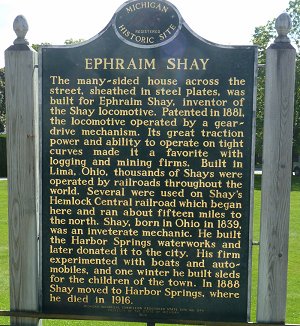 | Some have called shay eccentric... He designed and lived in a steel clad house called "The Hexagon". The walls were embossed to look like brick and the window frames were made to appear as stone. The heavy doors were sheathed with imitation carved wood. His machine shop building was across the street and close by was his Harbor Springs Waterworks. He supplied the city with water for many years and his business card had a locomotive on one side and a rendering of the waterworks on the other. He was a well-known inventor and his firm experimented with boats and automobiles. Mr. Shay even used galvanized sheet metal to build a steam yacht. Known as the AHA it operated on Little Traverse Bay. The rusting hulk of the AHA was, for a number of years, on display at the Maritime Museum in Mackinaw City, Michigan. | ![]() Historic Marker Photo by David Higley |