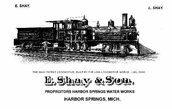 In 1882 Shay had printed a 12 page circular mentioning both Machine Works. Shay also in November of 1883 traveled with George Disman of Lima Locomotive Works through the southern states promoting and selling the locomotives. In May and June of 1883 Shay was in Chicago for the National Exposition of Railway Appliances as an exhibitor with a model of his Shay engine. In July he was in Santa Fe NM for the completion of the A.T. & S.F. line through AZ. In the fall he was attending the Wexford County Fair in Cadillac Michigan.