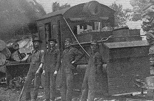 What Ephraim Shay had invented was a locomotive capable of delivering equal torque directly to wheels on both sides of the engine at the same time. This over came the dynamic force of his common rod engine whose normal pistons strokes jerked the engine side to side on each stroke, delivering excessive force to the wood rails, especially on the curves. You'll note that there is no outside driveline at this time. The locomotive worked but it was not perfect and Shay had to keep working on it to improve it over the winter of 1877-78. There is no exact description, photograph or drawing of the gearing on the two-cylinder engine Crippen built however, Ephraim describes in a letter that the locomotive had reversing. Since William Crippen copied and built it for other loggers we are fortunate to have a photograph of a copy of "The Original Shay" built by Ephraim Shay. |